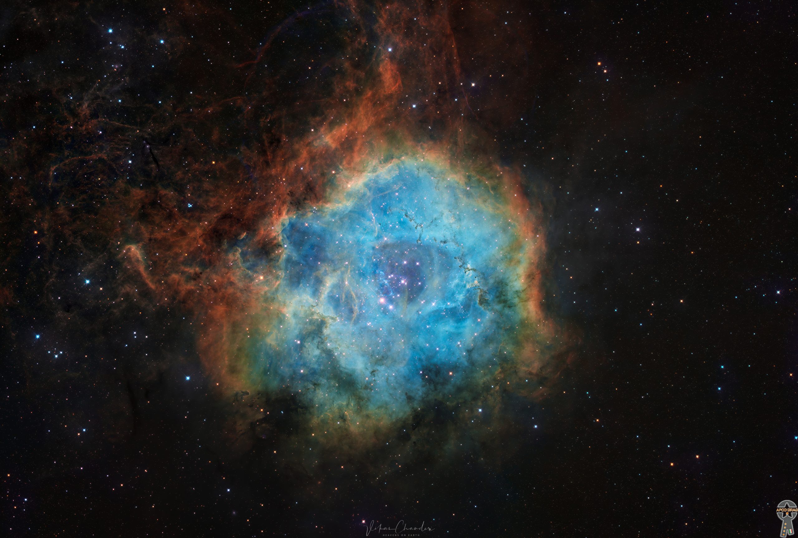 Valentine’s day is around the corner and a cosmic rose from space greets the viewer in rich tones of gold, green and blue. The Rosette nebula is a popular target for astrophotographers as it is large and bright, and fits into the field of view of most widefield telescopes. Imaged here in narrowband filters of Sulphur, Hydrogen and Oxygen one can view the various gases along with opaque towers of dust which rise from the billowing clouds around its core. At its core also lies a star cluster designated NGC 2244, an open cluster of hot massive stars which also illuminate the nebula….