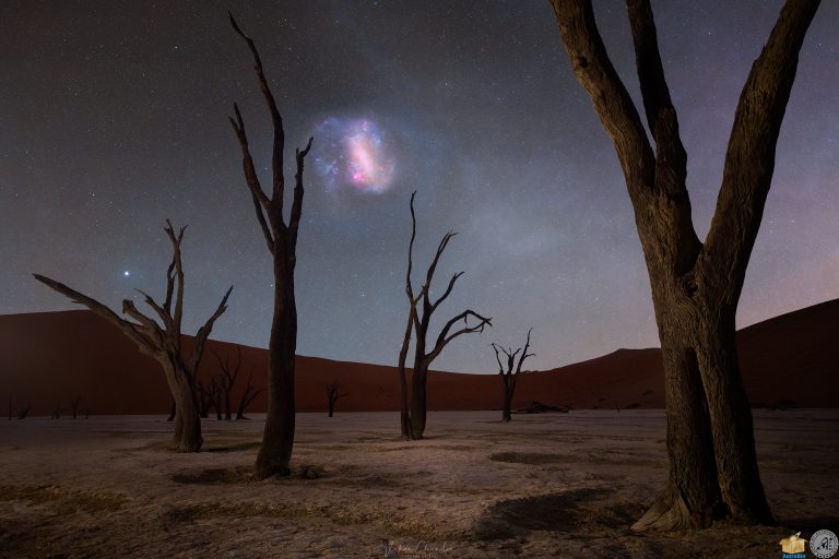 When shooting astro images in the southern hemisphere, one has the opportunity to view many targets which are just not visible in the northern hemisphere. The Larger Magellanic cloud is one such southern gem shining bright in Namibia and is visible to the naked eye as a faint cloud. With an astro modded camera, its true shape emerges along with its h-alpha emissions. Juxtaposed against the petrified trees of the iconic DeadVlei, a compelling nightscape emerges…