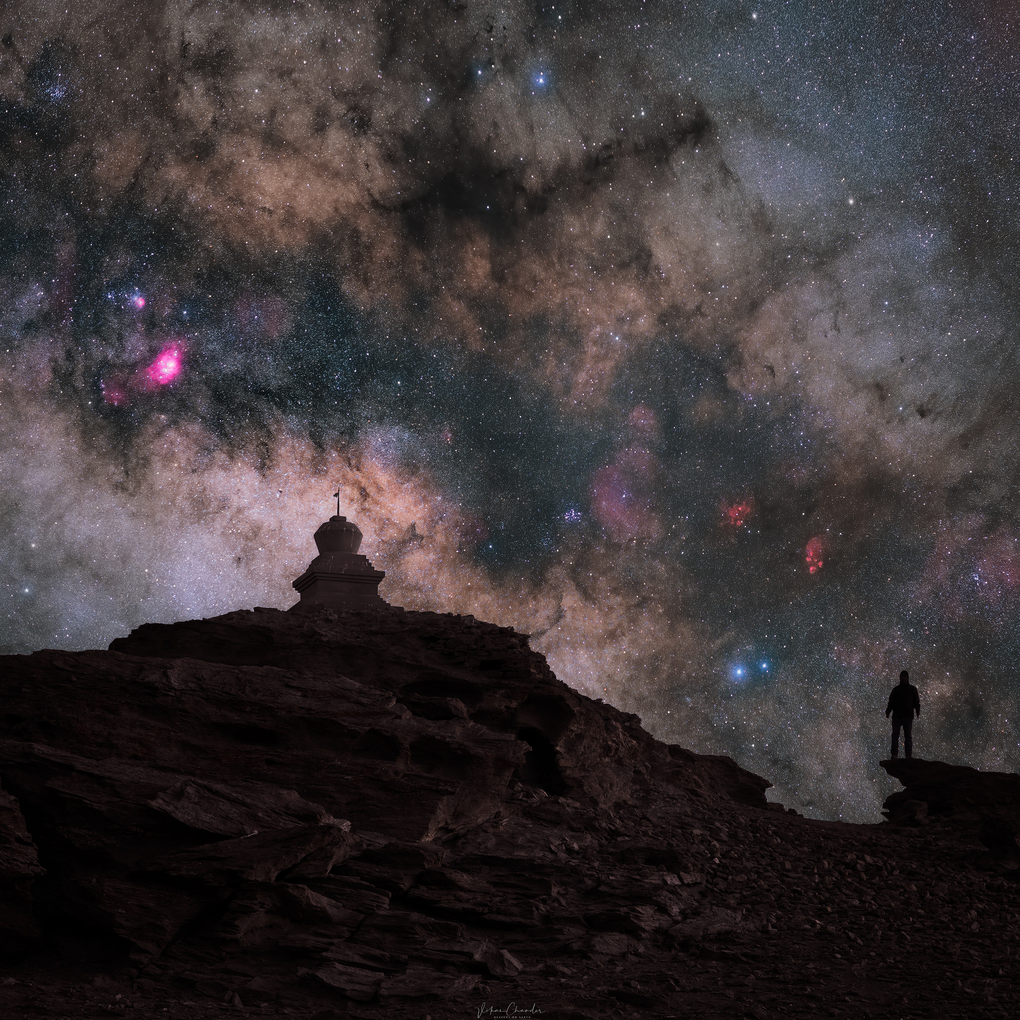 Hanle, Ladakh, India has to be hands down one of the finest locations for astrophotography in the world. At 14500ft above sea level much of the dense atmosphere is below us making for some exceptionally clear skies. That the area is a cold desert in the rain shadow means it is cloud and haze free much of the year. If one can brave the high altitude and the resulting drop in oxygen level, the possibility of mountain sickness and the cold temperatures and winds which gust up to 50kmph, then there is no better place for astrophotography than Hanle. Of late I have been dabbling with longer focal lengths above 50mm. The sky is tracked and then later blended with the untracked blue hour foreground. Seen here is one such effort in 55mm. My assistant who accompanies me on almost all my trips gracefully forms the human element in this frame…..